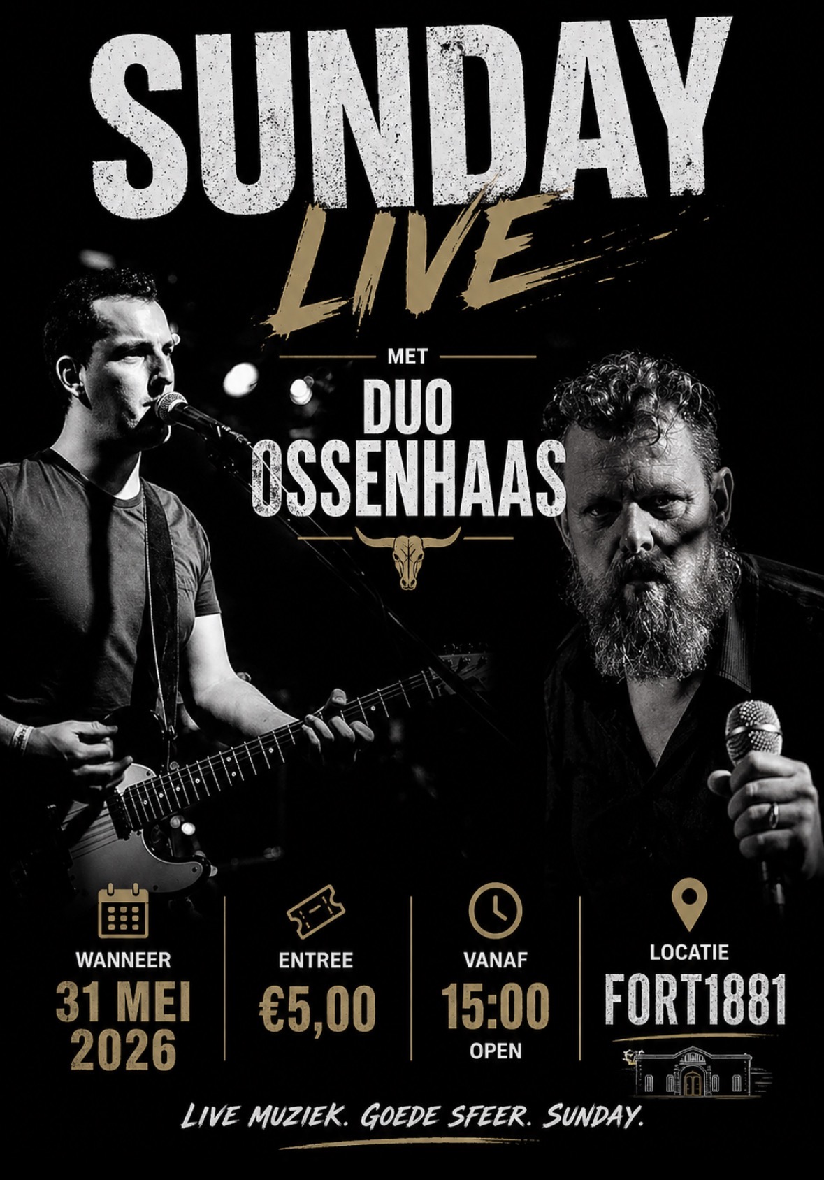 Zondag 31 mei is het weer tijd voor Sunday Live bij Fort1881! Vanaf 15:00 uur genieten van live muziek in het sfeervolle M-gebouw. Dit keer met Duo Ossenhaas 🎸