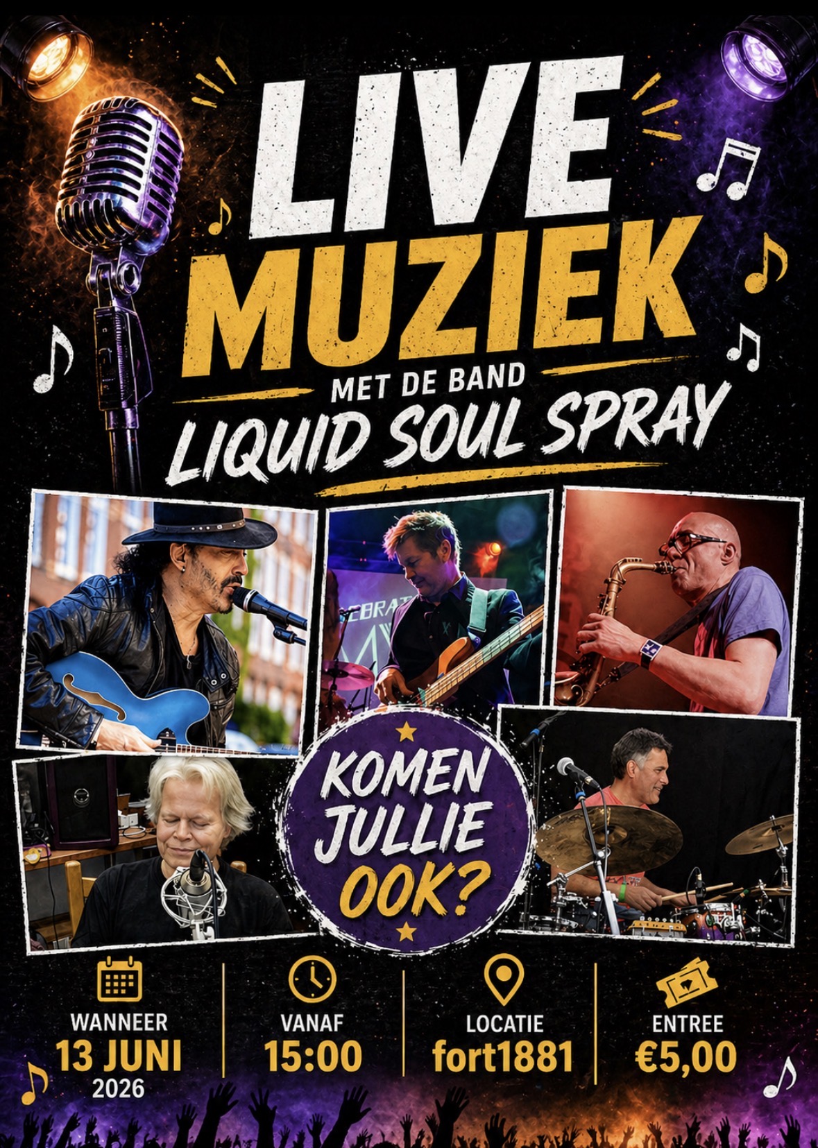 Zin in een heerlijke middag vol muziek, sfeer en gezelligheid? Kom dan genieten van Liquid Soul Spray , een strakke funk/soul/R&B band met uitstapjes naar reggae, blues, shuffles en jazz. 🔥
